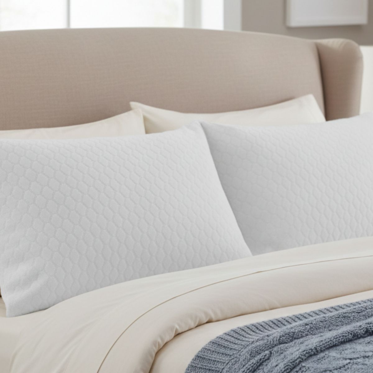Proteggi i tuoi guanciali e migliora la qualità del riposo con il set da 2 copriguanciali in tessuto jersey jacquard, progettati per unire funzionalità, morbidezza e resistenza.