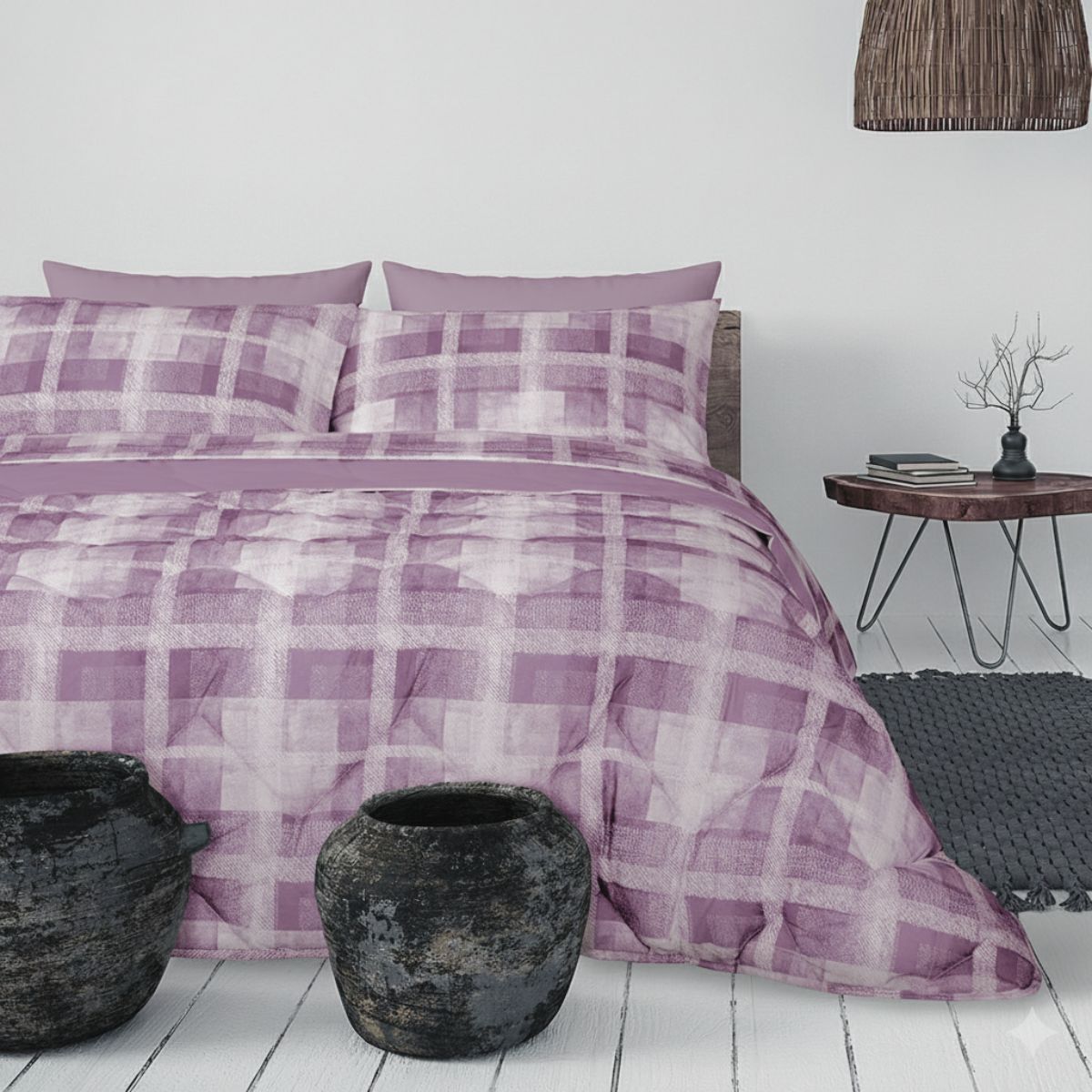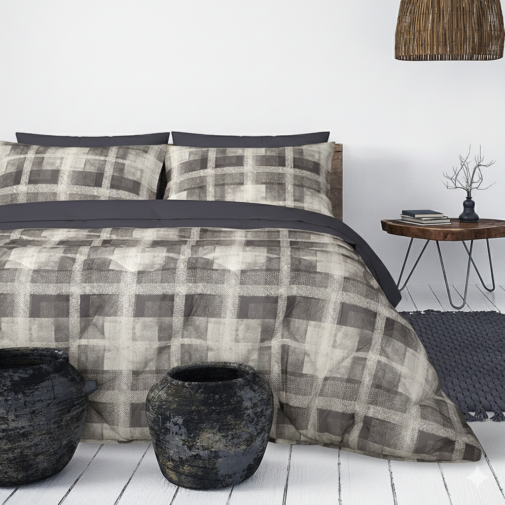 Casahomewear presenta il Completo Letto di puro cotone made in Italy Happidea con geometria scozzese dallo stile moderno e il tratto sfumato.