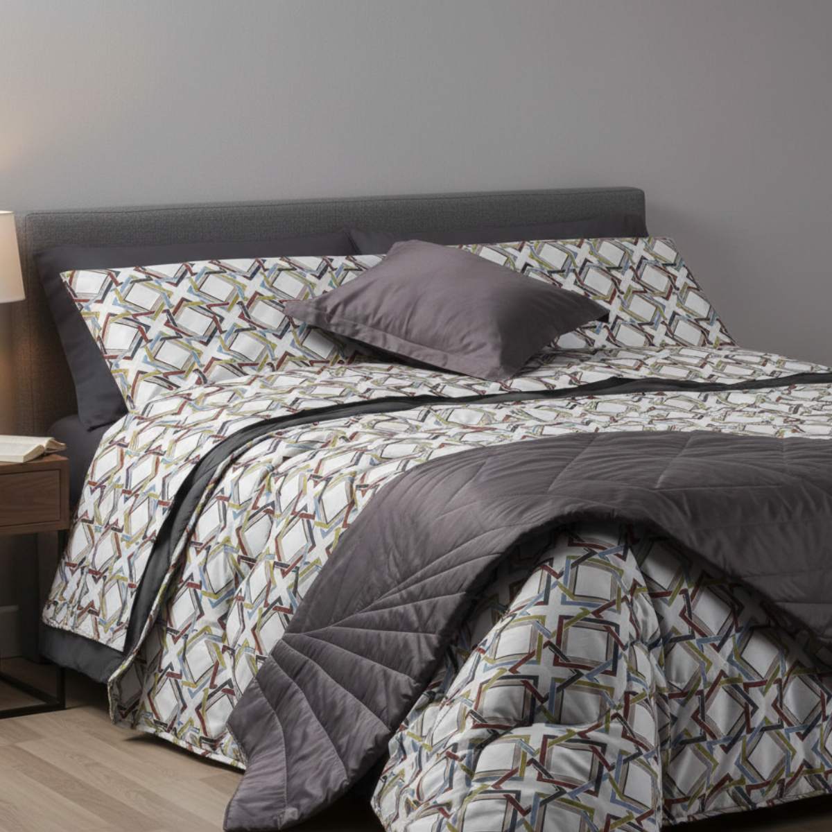 Completo letto in cotone con moderna ed elegante stampa geometrica multicolore. Ideale per ogni camera da letto, dall'arredo classico a quello più essenziale. disponibile in diverse misure. Il set si compone di federe e lenzuolo sopra stampato, mentre il lenzuolo sotto con angoli è in tinta unita coordinata.